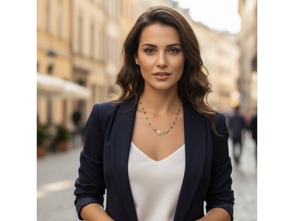 Tento jemný kúsok s anjelským krídlom ti vždy pripomenie, že si chránená a obklopená láskou. Čierne kamienky v retiazke a jemné kryštáliky na krídle robia tento šperk výnimočným.