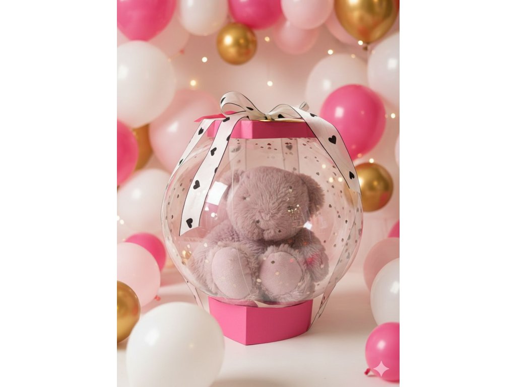 Zabudnite na klasické darčekové tašky. Náš luxusný darček v balóne je unikátny spôsob, ako darovať radosť a emóciu v jednom balení. Vo vnútri krištáľovo čistého a odolného balóna sa nachádza jemný plyšový zajačik, ktorý akoby sa vznášal v oblaku konfiet.