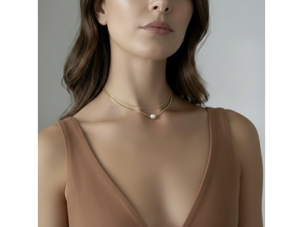 Tento kúsok je nápaditý, originálny a má štýl! Dve retiazky s masívnou perlou a k tomu prekvapenie vzadu! Druhá perla, ktorá visí na jemnej retiazke a spraví z tvojho chrbta dokonalé umelecké dielo.