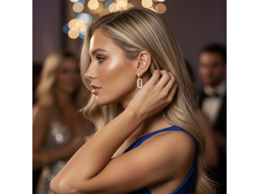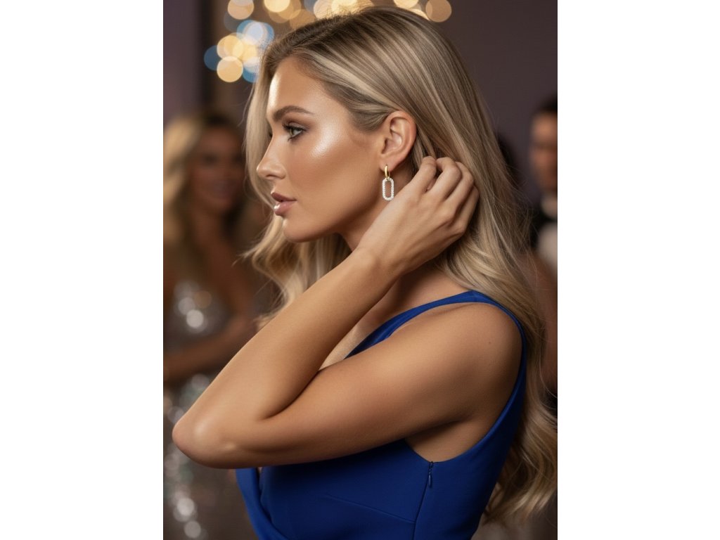 Náušnice, ktoré pripomínajú reťaz. Jedna časť je lesklá a druhý kúsok je kamienkový. Výrazný doplnok k outfitom.